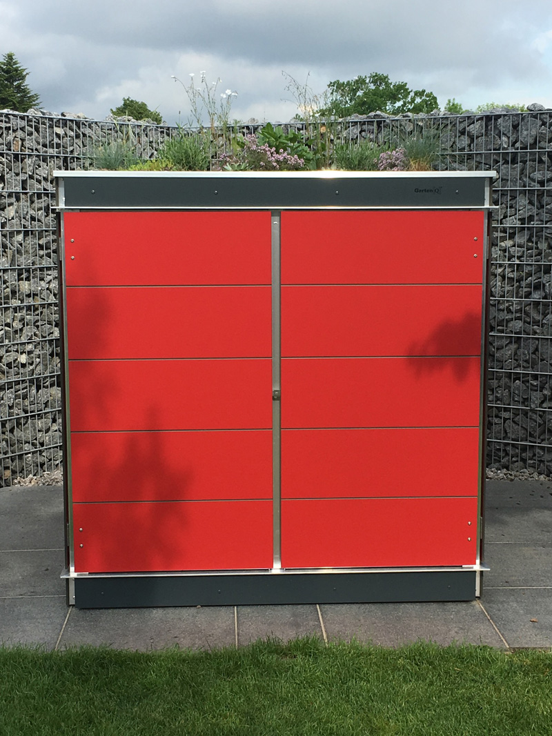 Für alle, die viel zu verstauen haben, gibt es beispielsweise in einem Garten[Q]-PURE XL, der über eine Breite von 234 cm verfügt, eine Werkzeugwand, ein Regal für Blumentöpfe und Kleinkram sowie ein großes Fach für Rasenmäher, Grill und Fahrräder.