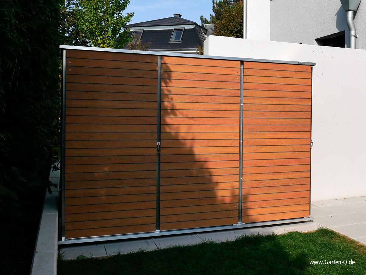 È inoltre possibile combinare più Garden[Q]Teras-XL tra loro. È anche possibile posizionare due Teras-XL uno dietro l'altro. Pannelli Trespa aggiuntivi collegano entrambi i modelli. Si può anche combinare facilmente con un Garten[Q]Trash, il nostro recinto per i rifiuti, o con i nostri rifugi "Vari". In questo modo, otterrete una soluzione di archiviazione esattamente adattata alle vostre esigenze. Lasciatevi consigliare sulle possibilità. Telefono: +49 (0)89 - 244 1841-0