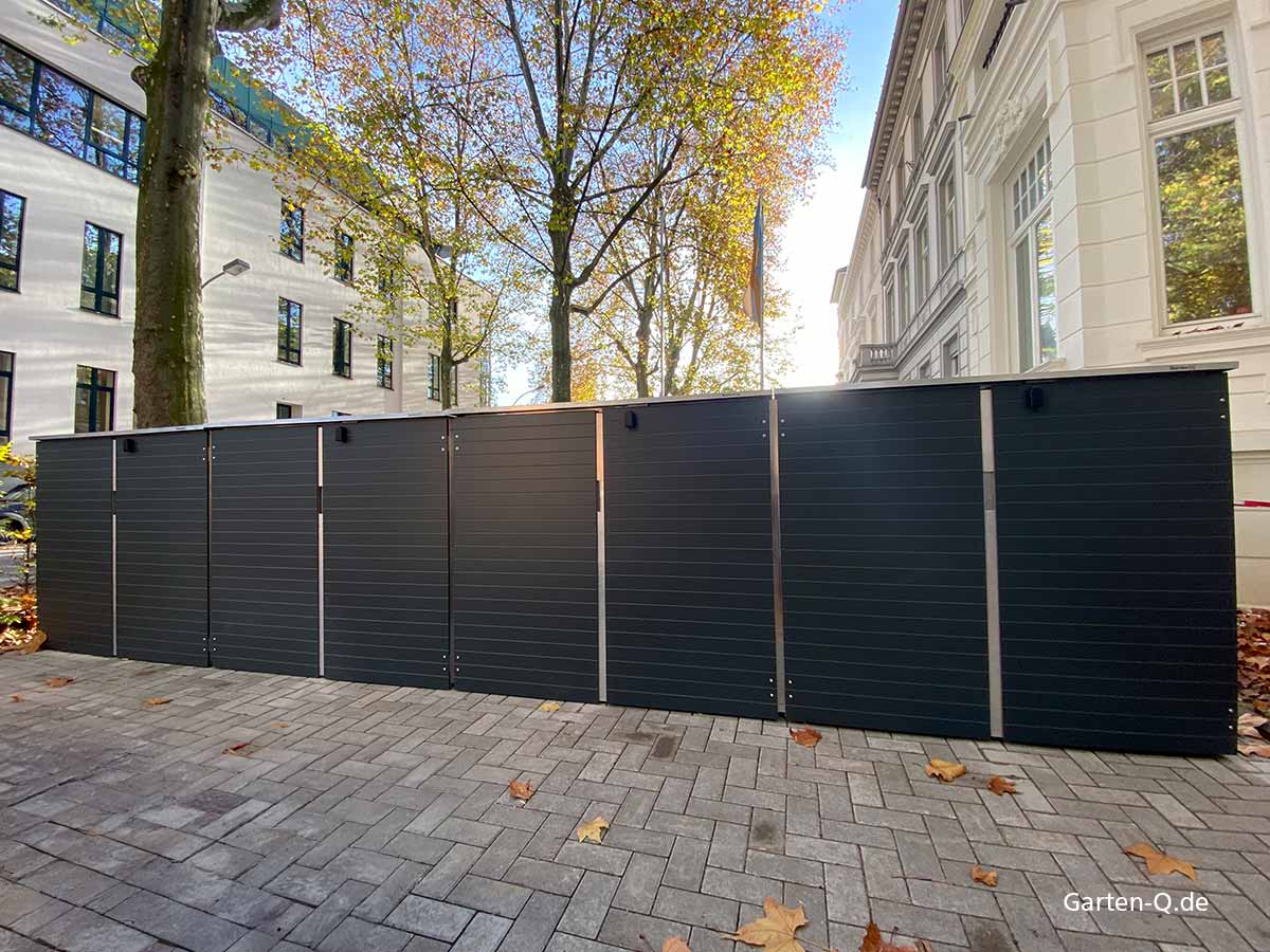 Nascondete i vostri cassonetti da 1.100 o 770 litri in modo compatto e resistente alle intemperie. Non c'è bisogno di un enorme contenitore per nascondere uno o più cassonetti. Con Garten[Q]-Trash-L, il contenitore dei rifiuti diventa un elemento di design.